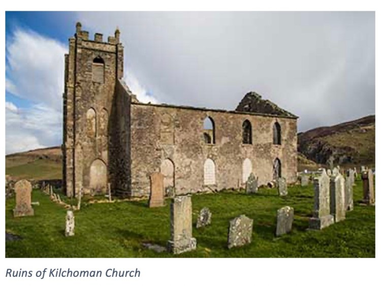 The parish of Kilchoman is located on the west side of the island. Ruins of the church by the same name, built in 1827, stand on the same site as an earlier medieval church and Christian chapel prior to that.